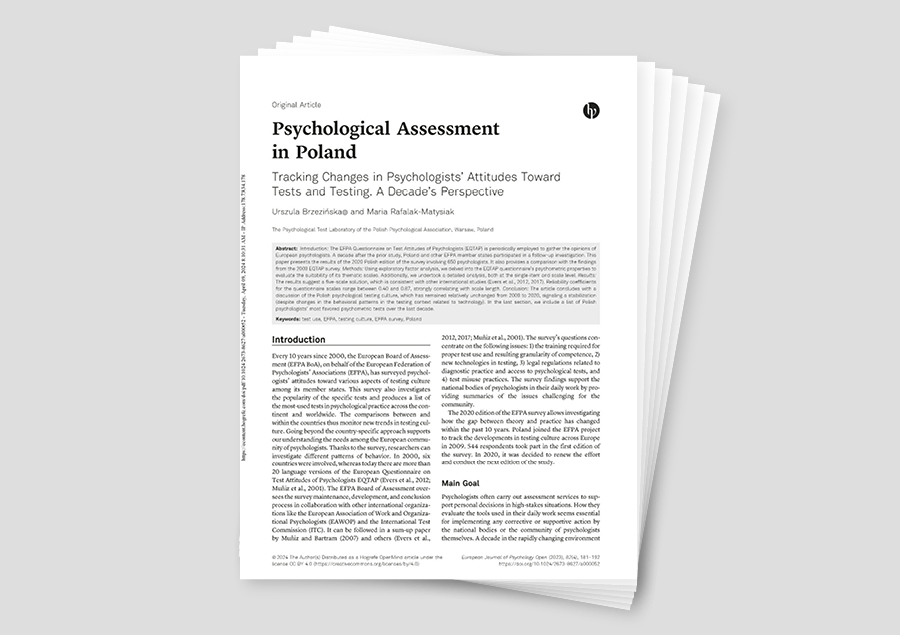 Zachęcamy do lektury nowego opracowania podsumowującego ważniejsze trendy mające wpływ na kształtowanie się kultury testowania w Polsce w latach 2009–2020. W ostatniej części artykułu można również zapoznać się z rankingiem popularności testów psychologicznych wskazanych jako najczęściej stosowane przez psychologów, którzy wzięli udział w sondażu. Artykuł autorstwa Urszuli Brzezińskiej i Marii Rafalak-Matysiak pt. Psychological assessment in Poland: Tracking changes in psychologists’ attitudes toward tests and testing. A decade’s perspective został opublikowany w czasopiśmie European Journal of Psychology Open.